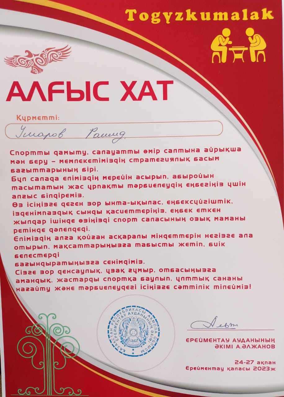 Умаров Рашид Ерейментау қаласында ҚР Білім беру ісінің үздігі Балташ Сыздықұлы Дүйсеновты еске алу құрметіне арналған VII Республикалық тоғызқұмалақ ойынына төрелік еткені үшін алғыс хатпен марапатталды
