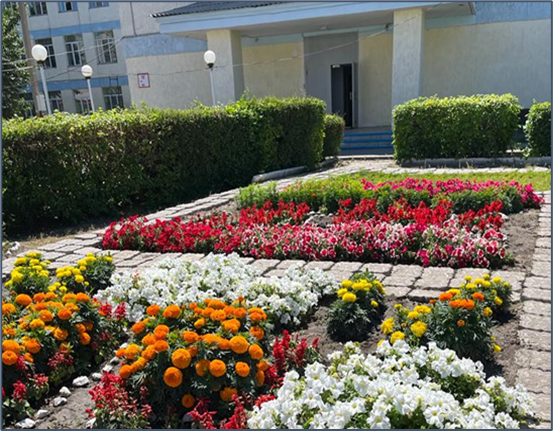 Оқу ғимараты айналасысүректі өсімдіктермен, күнгей бетікөкшөптермен, гүлзарлармен көркемделген. Ағаштар- көлемі мен биіктігін есепке алып топтап отырғызады. Мысалы: шырша, итмұрын, шиесияқты әсем гүлдері бар өсімдіктер отырғызылған.Демалуға арналған мұндай алаңқайлар ғимаратқа жақын орналастырылды.