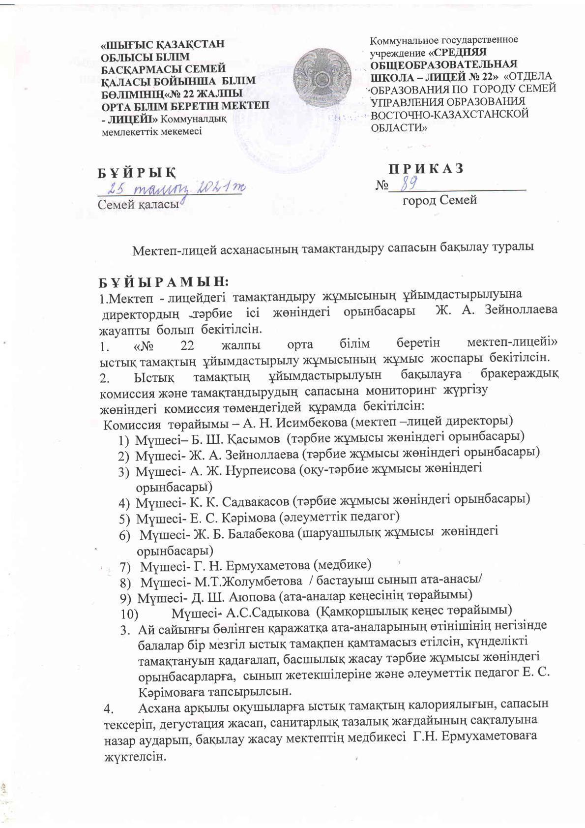 Мектеп-лицей асханасының тамақтандыру сапасын бақылау туралы. » Средняя общеобразовательная школа № 22