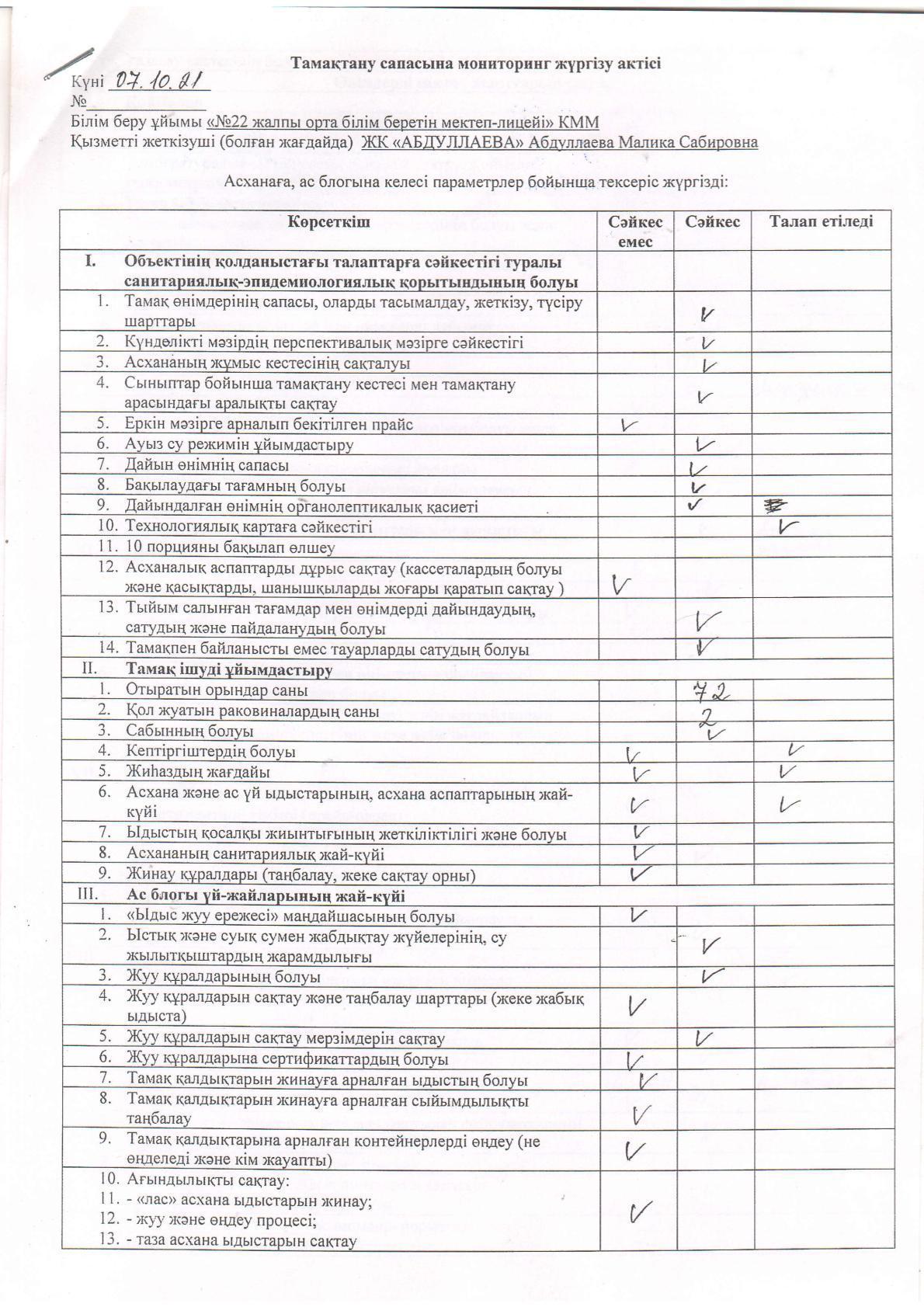 Тамақтану сапасына мониторинг жүргізу актісі » Средняя общеобразовательная школа № 22