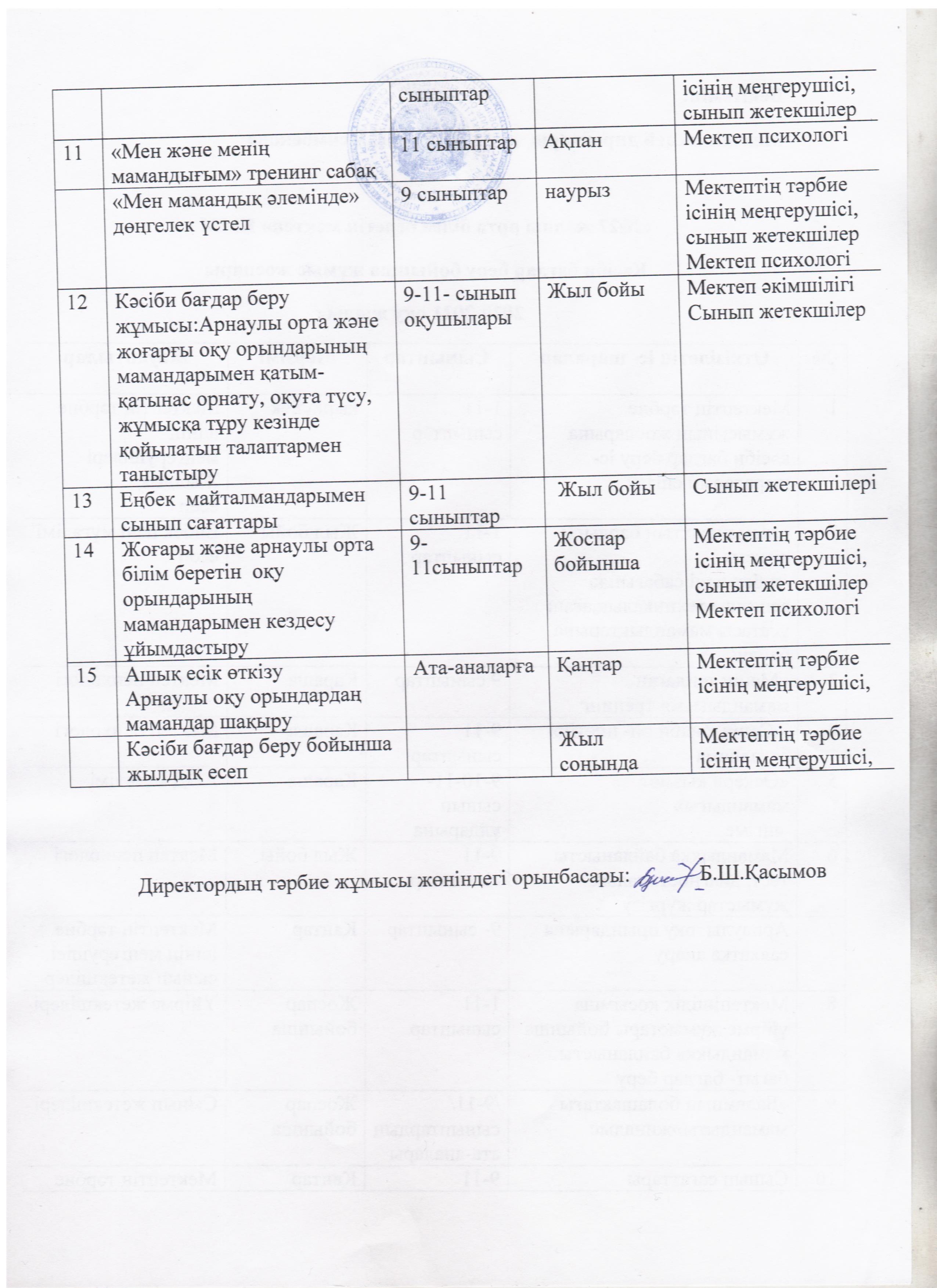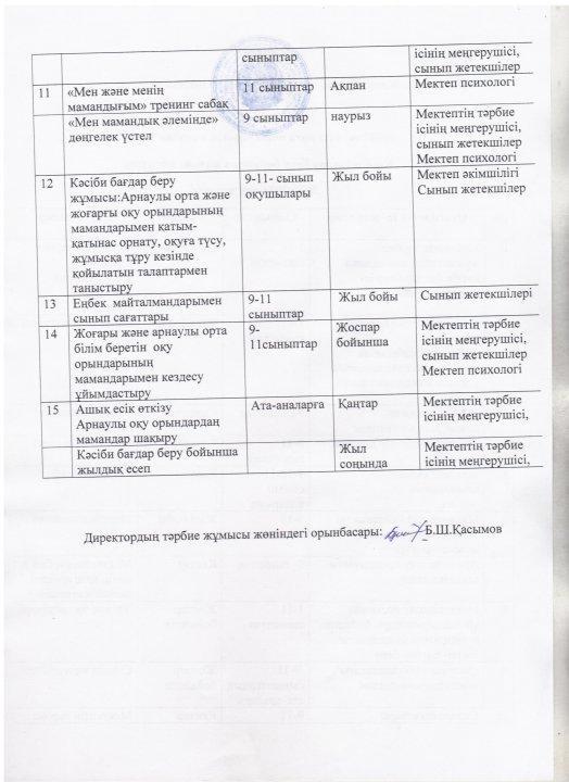 Кәсіби бағдар беру бойынша жұмыс жоспары
