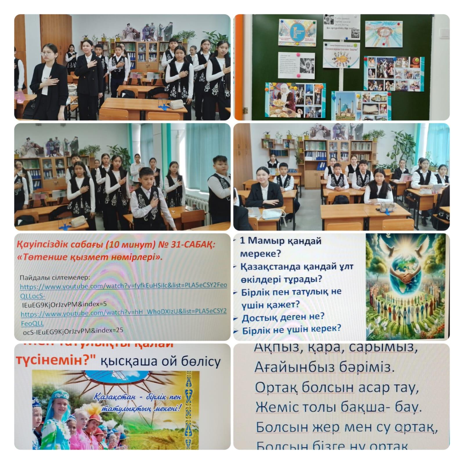 28.04.2025ж. 7 «А» сыныбында «Біз әртүрліміз, бір теңбіз» тақырыбында тәрбие сағаты өткізілді. Тәрбие сағатының мақсаты: Қазақстан Республикасындағы халықтардың ынтымақтастықпен, бірлікпен, тең құқықпен өмір сүріп жатқандығын және оны үлгі етіп, әр халықтың салт - дәстүрлерін сақтап келе жатқан қаншама ұлттардың салт - саналарынан хабардар ету, балалардың өз өнерлерін көпшілік ортаға салу арқылы шығармашылық білімдерін көрсету, балалардың жаңа қырларын ашу. 10 минуттық «Жедел жәрдем нөмірлері және сенім телефондары» тақырыбындағы қауіпсіздік сабағында оқушыларға төтенше жағдайларда көмекке келетін қызметтер туралы айтылып, төтенше жағдайлар қызметі мен сенім телефондарының нөмірлерін қалай дұрыс пайдалану керектігі жайлы ақпараттар берілід. Аптаның дәйек сөзі: «Білікті білім жинап кәсіп етер, білімнің дәмін татып өсіп өнер», құндылық: Сәуір – еңбекқорлық және кәсіби біліктілік айы.