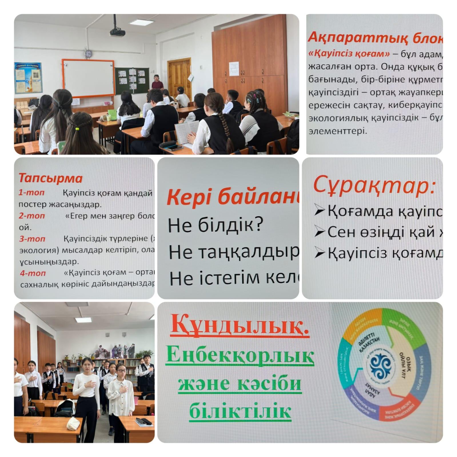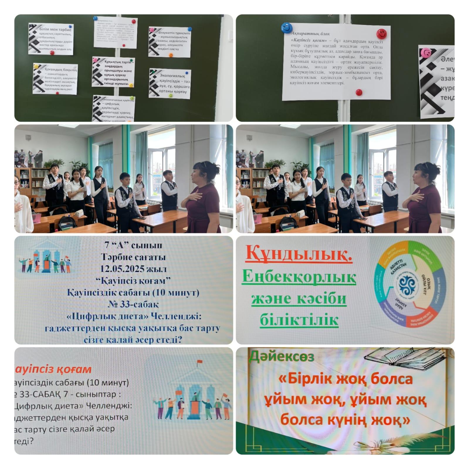 12.05.2025ж. 7 «А» сыныбында жоспарға сәйкес «Қауіпсіз қоғам» тақырыбында кезекті тәрбие сағаты өтті. Сабақтың мақсаты: оқушылардың отбасы, жанұя туралы білімдерін шыңдай түсу, отбасы құндылықтарының маңызын дәріптеу; оқушылардың есте сақтау, ойлау қабілеттерін, тіл байлығын, өз беттерінше жұмыс істеу дағдыларын дамыту; оқушыларды ұйымшылдыққа, жауапкершілікке, ептілікке, өз ойын жеткізе білуге, отбасы құндылықтарын сыйлауға тәрбиелеу. «Цифрлық диета» Челленджі: гаджеттерден қысқа уақытқа бас тарту сізге қалай әсер етеді? тақырыбы бойынша 10 минуттық қаіупсізідк сабағында оқушыларға гаджеттерден бас тартудың денсаулық пен әлауқатына әсері туралы айтылды. Осы аптаның дәйексөзі: «Бірлік жоқ болса ұйым жоқ, ұйым жоқ болса күнің жоқ» және барлық іс-шаралар «Мамыр – бірлік және ынтымақ айы» құндылығы төңірегінде жүргізіліп іске асырылады.