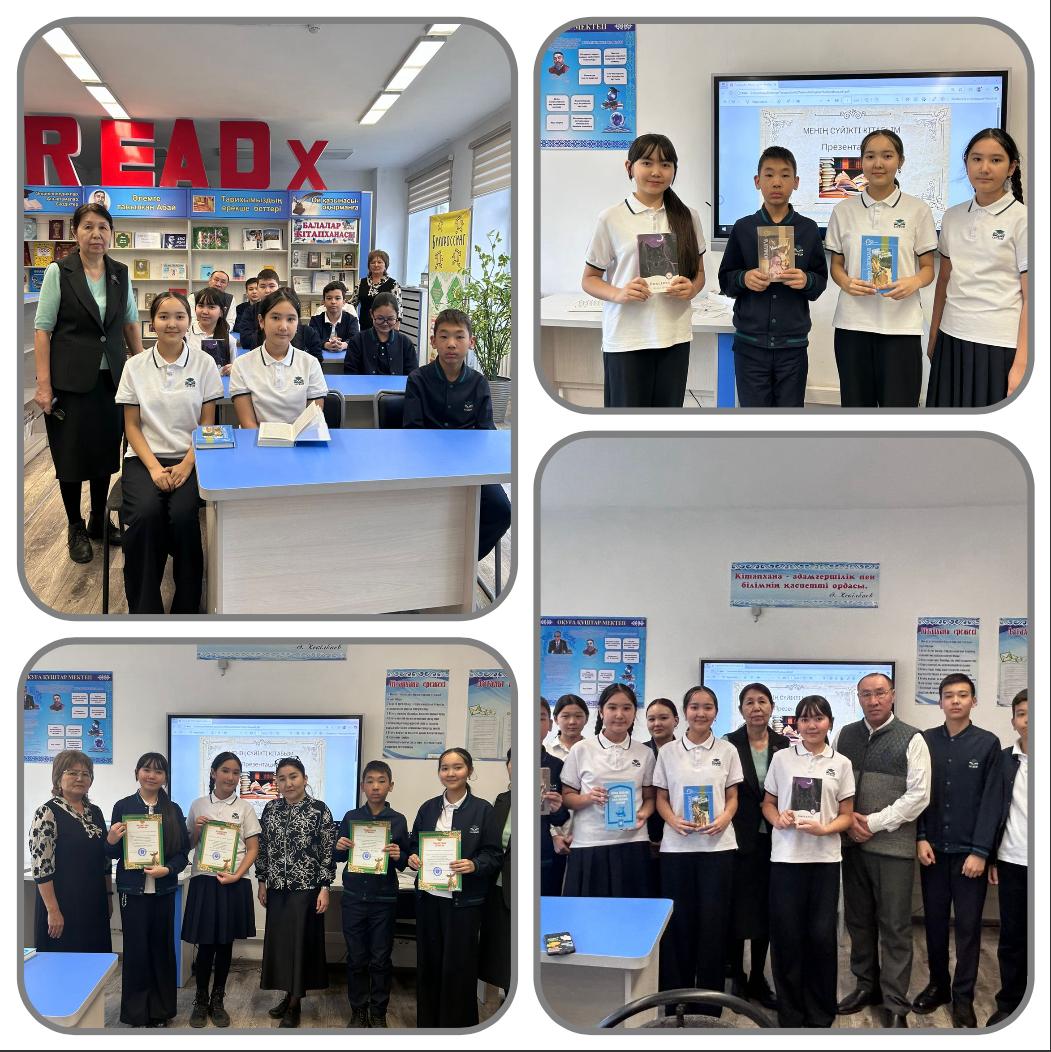 Мектеп кітапханасында "Балалар кітапханасы"жобасы аясында «Менің сүйікті кітабым» атты презентация 7- сынып оқушыларының арасында өтті. Мақсаты: Оқушылардың кітапқа деген қызығушылығын арттыру, ойлау, сөйлеу, таныстыру қабілеттерін дамыту.