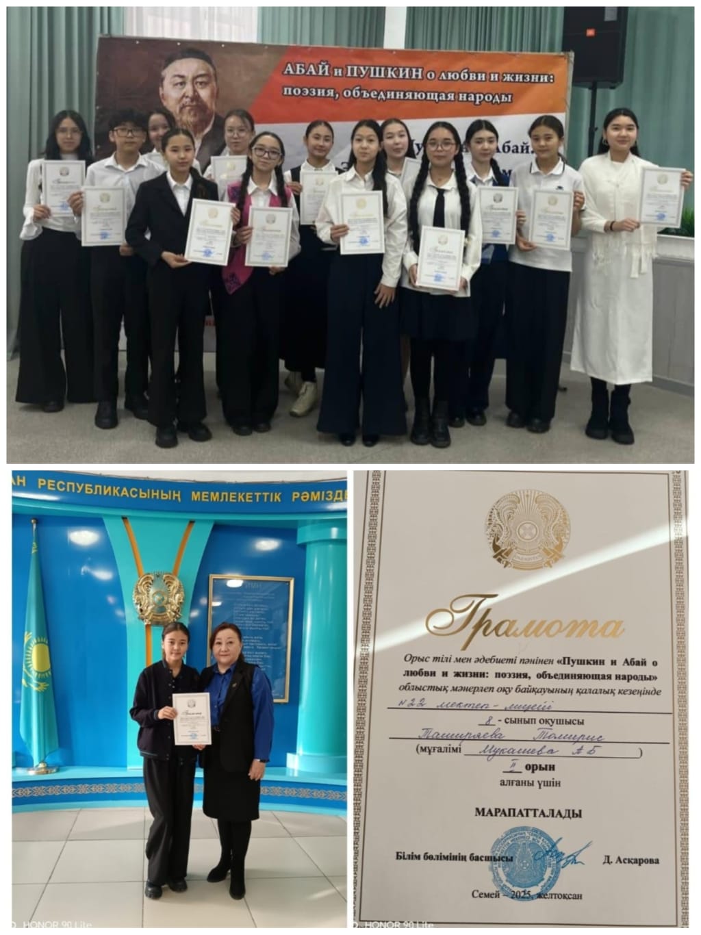 Орыс тілі мен әдебиеті пәнінен "Пушкин и Абай о любви и жизни: поэзия, объединяющая народы" облыстық мәнерлеп оқу байқауының қалалық кезенінде #22 мектеп-лицейінің 8 сынып оқушысы Таширяева Томирис 2 орын алды. Пән мұғалімі: Мукашева А. Б. » Средняя общеобразовательная школа № 22