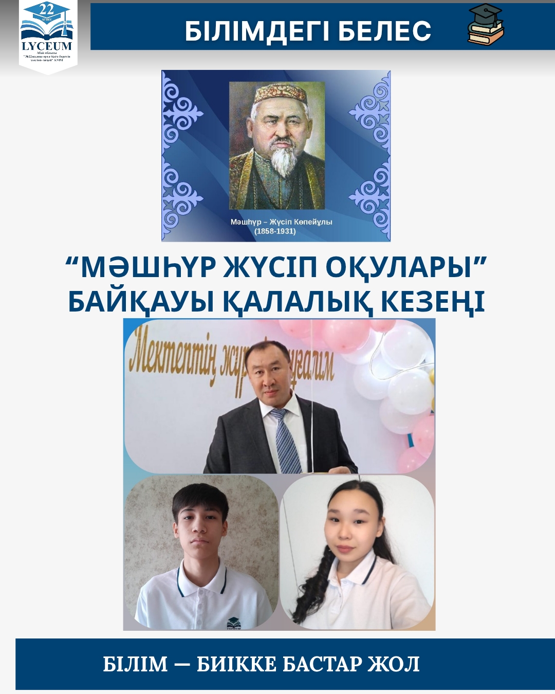1. 9 «Ә» сынып оқушысы Бақытбек Абдурахим ІІ орын, I бағыт «Алдыма өлең жаз деп қағаз келген, Сөзімді сөйлеп бақытым мен де білген» ақындар мүшәйрасы.