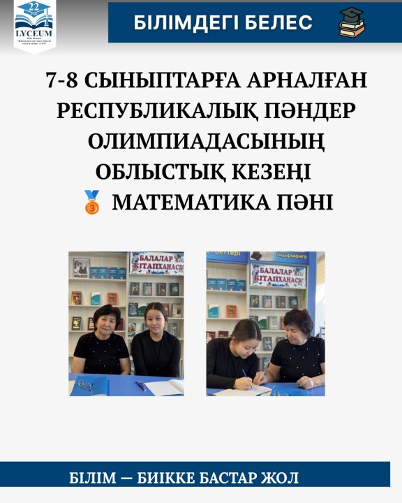 7-8 сыныптарға арналған Республикалық пәндер олимпиадасының облыстық кезеңінен математика пәнінен Үйсінғазина Еркенұр 3 орын иеленді, пән мұғалімі: С.Б. Кабышева Құттықтаймыз👏👏👏 » Средняя общеобразовательная школа № 22