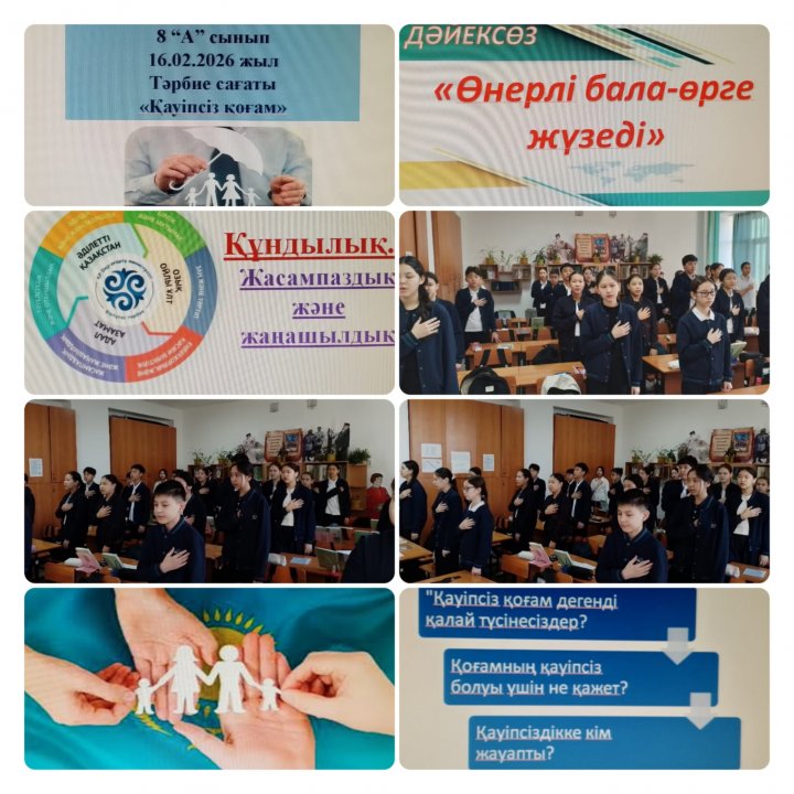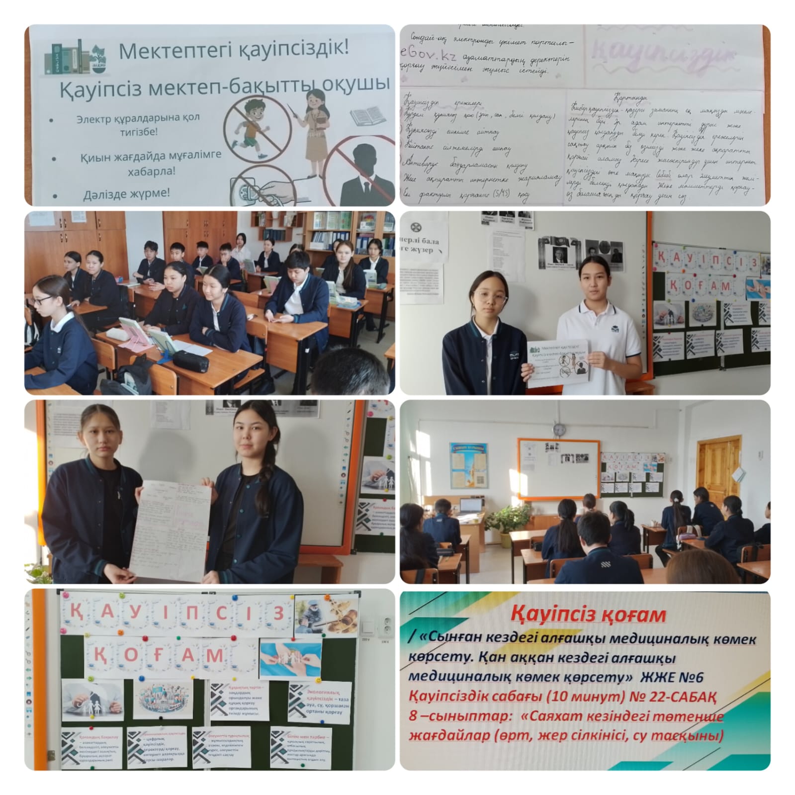 Сабақ мақсаты: Қауіпсіз қоғам ұғымын түсіндіру; қауіпсіз қоғамның негізгі элементтерін атау; қоғамдағы қауіпсіздікке қатысты өз пікірін білдіру және шешім ұсыну. Сонымен қатар ЖЖЕ №6 «Сынған кездегі алғашқы медициналық көмек көрсету . Қан аққан кездегі алғашқы медициналық көмек қөрсету» тақырыбы бойынша оқушыларға алғашқы көмек туралы мағлұматтар берілді. 10 минуттық қауіпсіздік сабағының «Саяхат кезіндегі төтенше жағдайлар (өрт, жер сілкінісі, су тасқыны) тақыбы төңірегінде әңгіме жүргізілді. Сабақ мақсаты мен міндеттері: саяхат кезінде төтенше жағдайларда дұрыс әрекет етуге және пайдалы әдеттерді дамытуға үйрету; білім алушыларды өрт, жер сілкінісі, саяхат кезіндегі су тасқыны жағдайларында қауіпсіз мінез-құлық қағидаларына үйрету. Апта дәйексөзі: