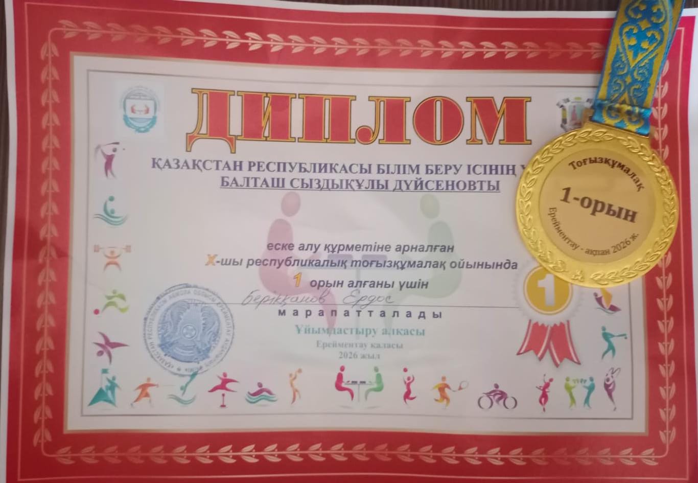 7 "А" сынып оқушысы Берікқанов Ердос Ерейментау қаласында Қазақстан Республикасының білім беру ісінің үздігі Балташ Сыздықұлы Дүйсеновты еске алу құрметіне арналған Х-шы Республикалық тоғызқұмалақ ойынында 1 орын алды.