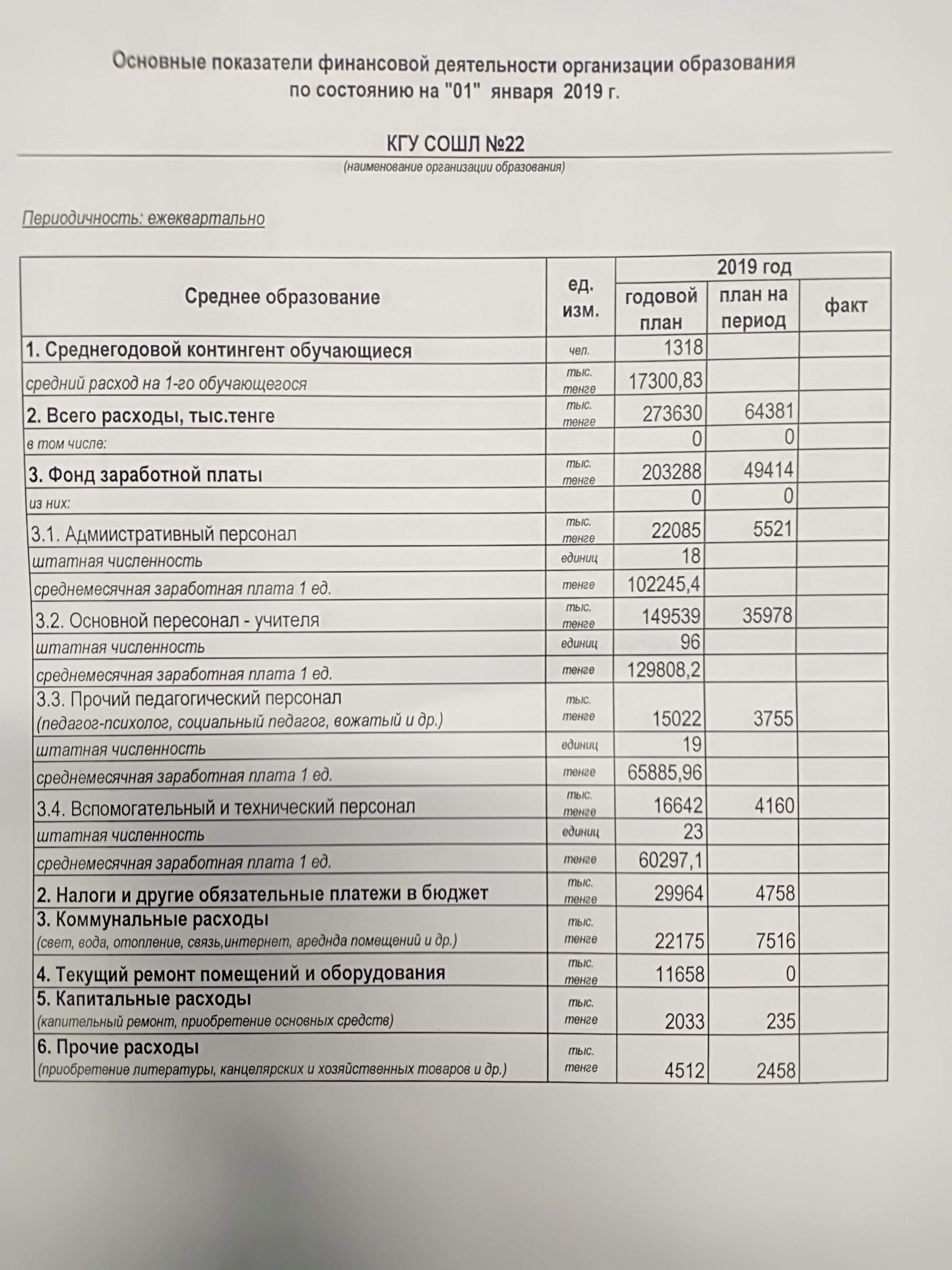 17 январь 2019 0 1 2 3 4 5 Основные показатели финансовой деятельности организации образования по состоянию на «01» января 2019 г