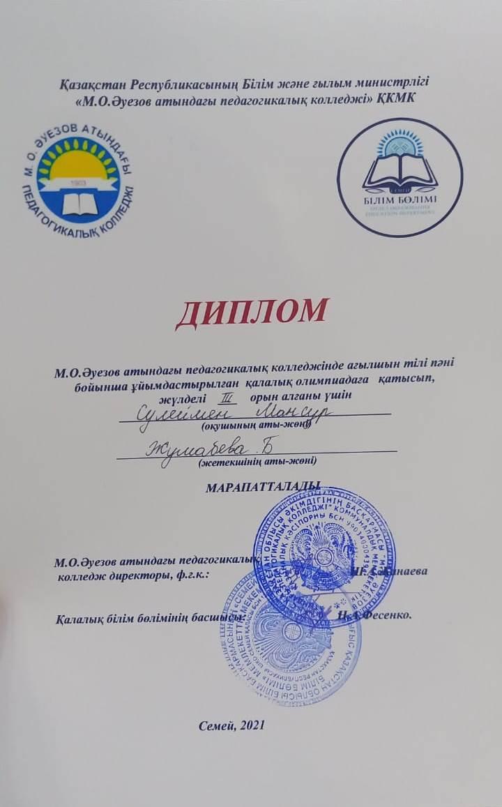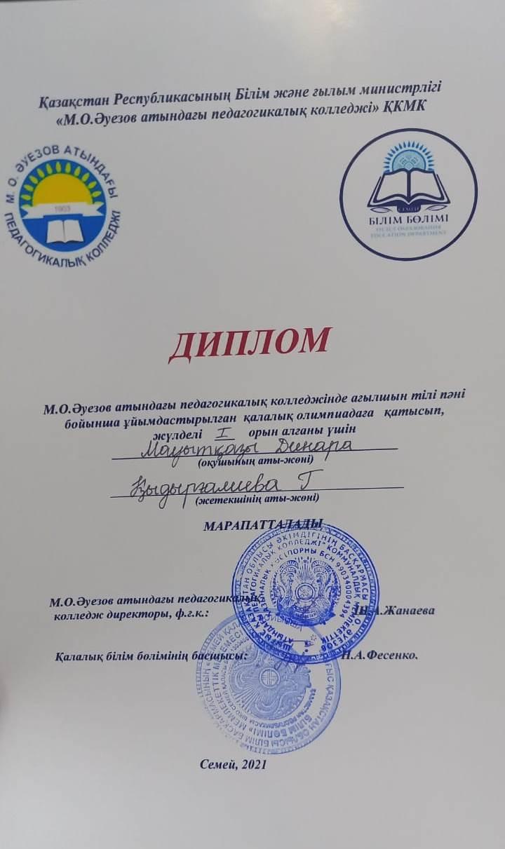 05 ноябрь 2021 0 1 2 3 4 5 М.Ә. Әуезов атындағы педагогикалық колледжінде ағылшын тілі пәні бойынша ұйымдастырылған қалалық олимпиада жүлдегерлерін құттықтаймыз!