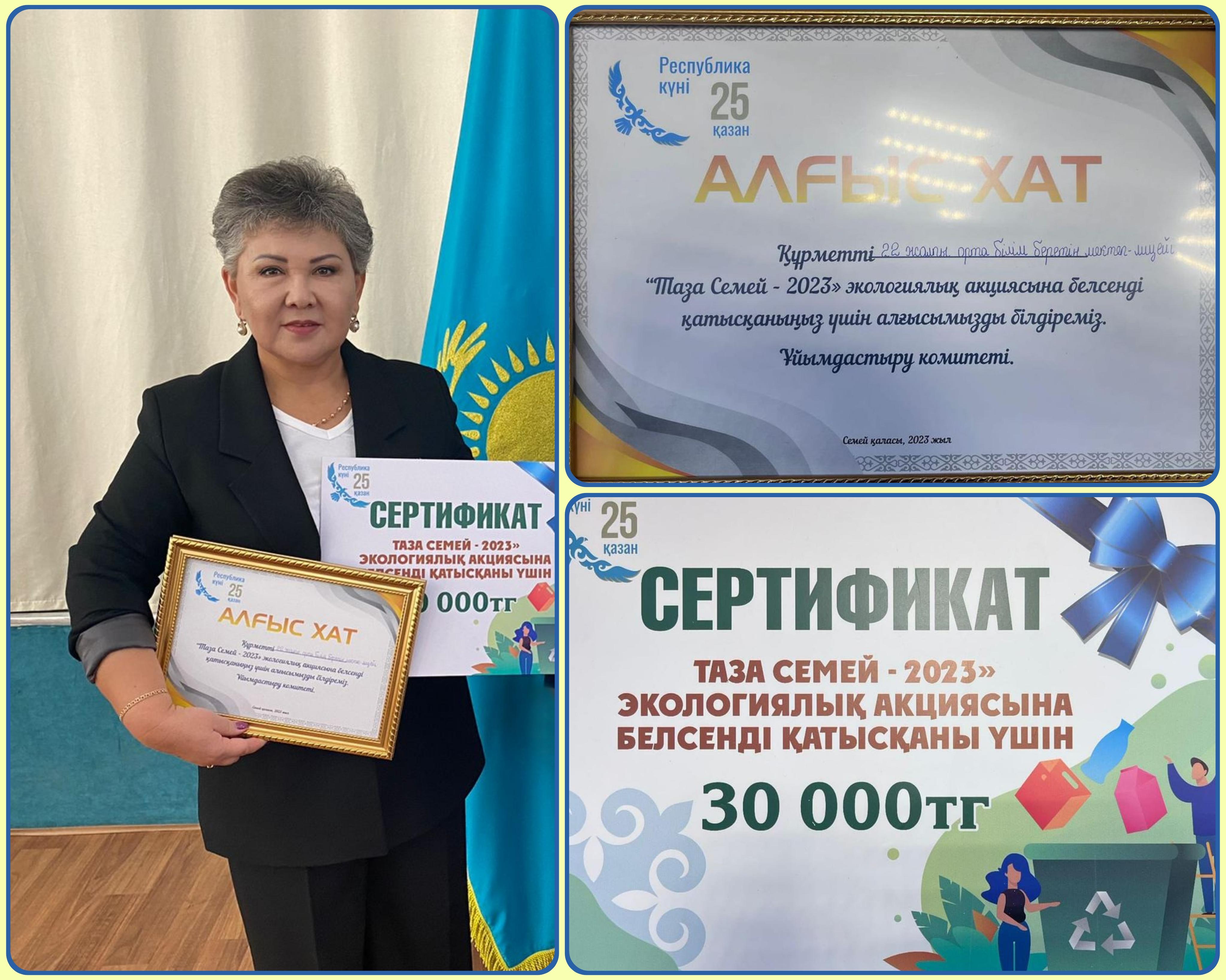 24 октябрь 2023 0 1 2 3 4 5 "Таза Семей - 2023» экологиялық акциясына белсенді қатысқан үшін АЛҒЫС ХАТ, СЕРТИФИКАТ. Құтты болсын! 👏🏻👏🏻👏🏻