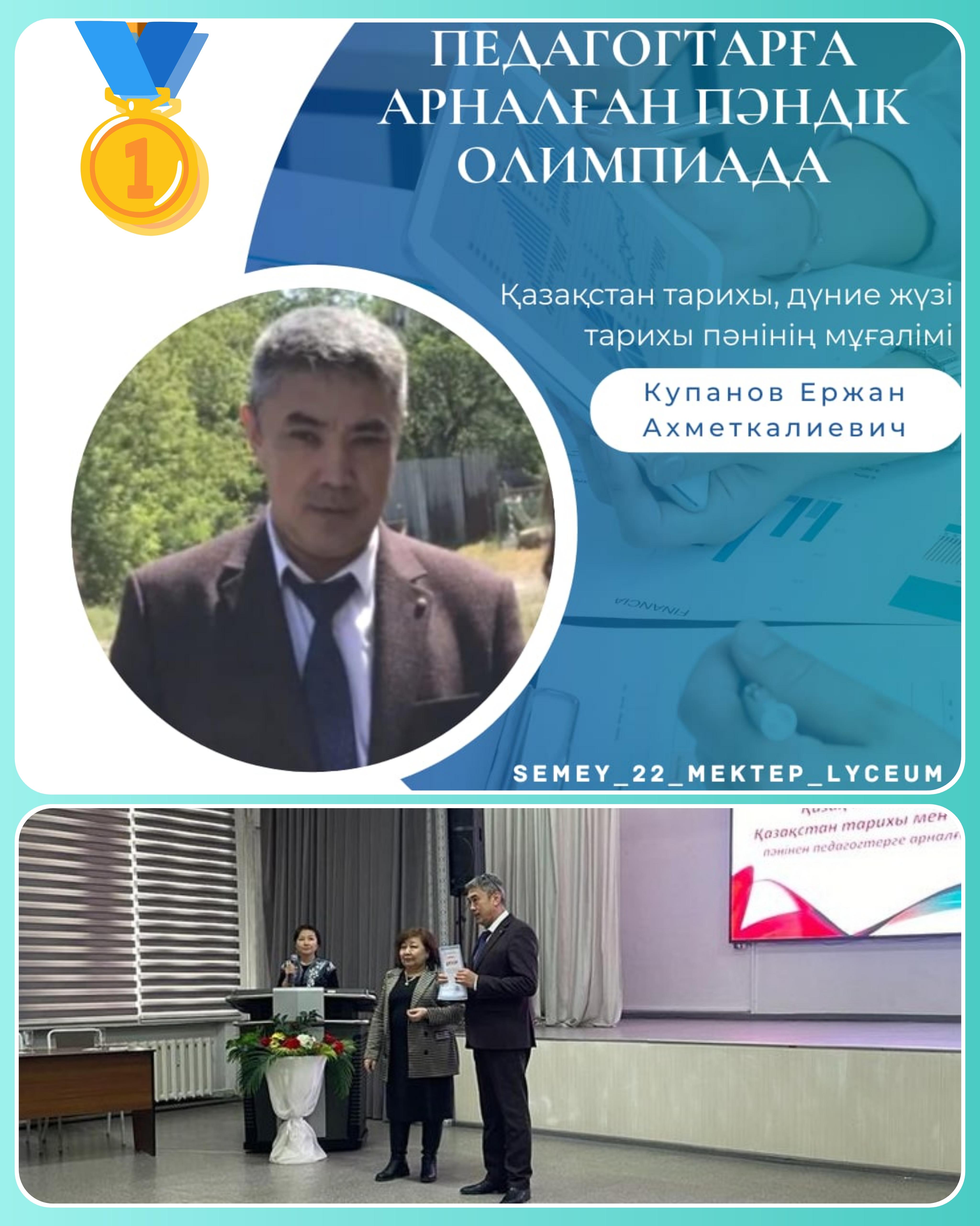 2024 жылдың 26 қаңтарында педагогикалық қызметкерлердің біліктілігін және кәсіби шеберлігін арттыруды қамтамасыз ету, пән мұғалімдерінің құзыреттіліктерін арттыру мақсатында өткен Қазақстан тарихы мен дүниежүзі тарихы пәні педагогтеріне арналған пәндік олимпиаданың облыстық кезеңіне №22 мектеп-лицейінің Қазақстан тарихы мен дүниежүзі тарихы пәнінің мұғалімі Купанов Ержан Ахметкалиевич 🥇1-орын иеленді. Құттықтаймыз!!! 👏🏻👏🏻👏🏻