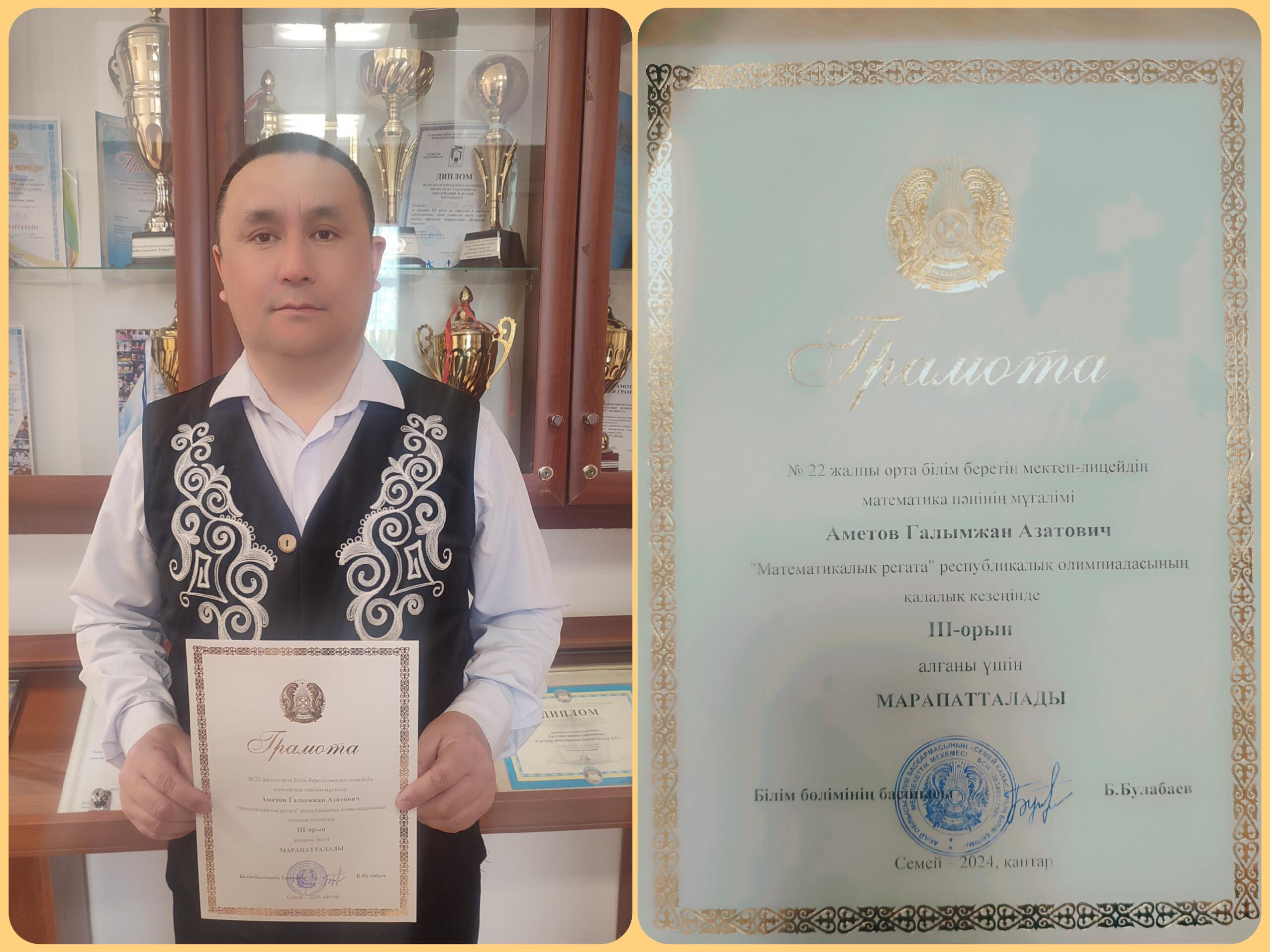№ 22 жалпы орта білім беретін мектеп-лицейдің математика пәнінің мұғалімі Аметов Ғалымжан Азатұлы «Математикалық регата» республикалық олимпиадасының қалалық кезеңіндн ІІІ-орын иеленді.