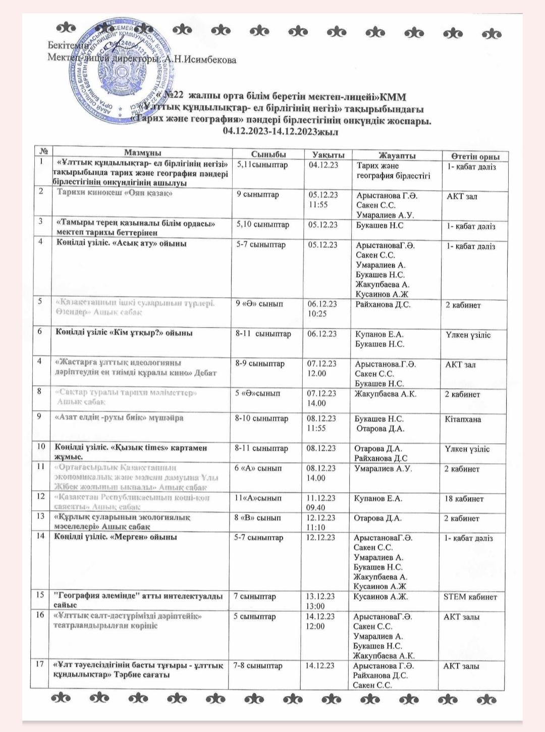 Тарих бірлестігінің онкүндігінің жоспары » Средняя общеобразовательная школа № 22