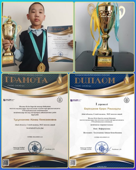 Жалпы білім беретін пәндер бойынша мектеп окушылары мен колледж студенттері арасында информатика пәні бойынша өткен I Республикалық олимпиададан Берікқанов Ердос І дәрежелі диплом иеленді. Жетекшісі: Тусупханова Айнаш Кенесбековна Құттықтаймыз!