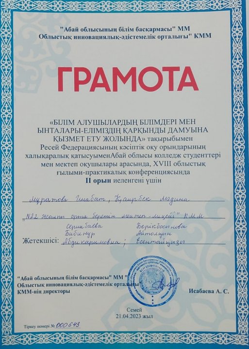Білім алушылардың білімдері мен ынталары-еліміздің қарқынды дамуына қызсет ету жолында тақырыбымен Ресей Федерациясының кәсіптік оқу орындарының халықаралық қатысуымен XVIII облыстық ғылыми практикалық конференцияда оқушыларымыз ІІ орын иеленді.
