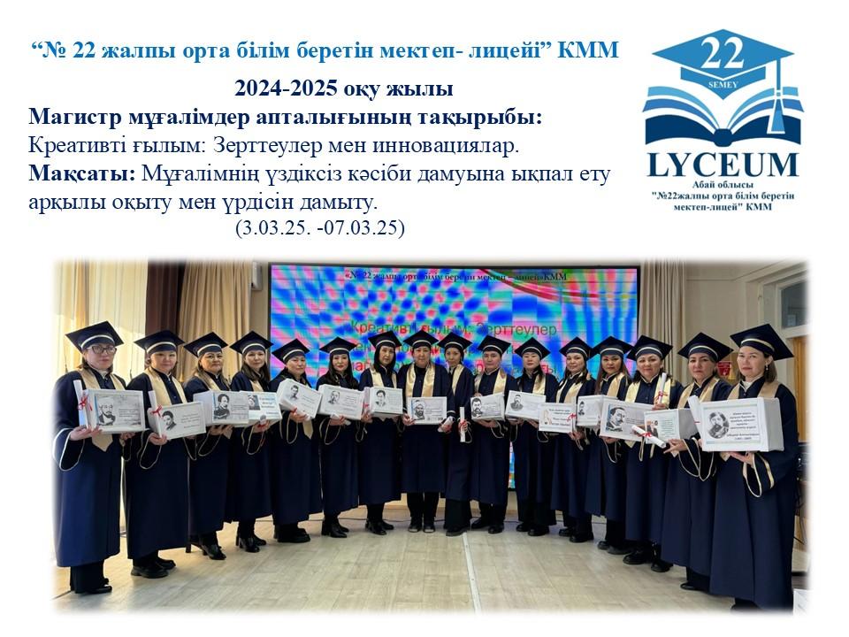 Магистр мұғалімдер апталығының тақырыбы: Креативті ғылым: Зерттеулер мен инновациялар. Мақсаты: Мұғалімнің үздіксіз кәсіби дамуына ықпал ету арқылы оқыту мен үрдісін дамыту. » Средняя общеобразовательная школа № 22
