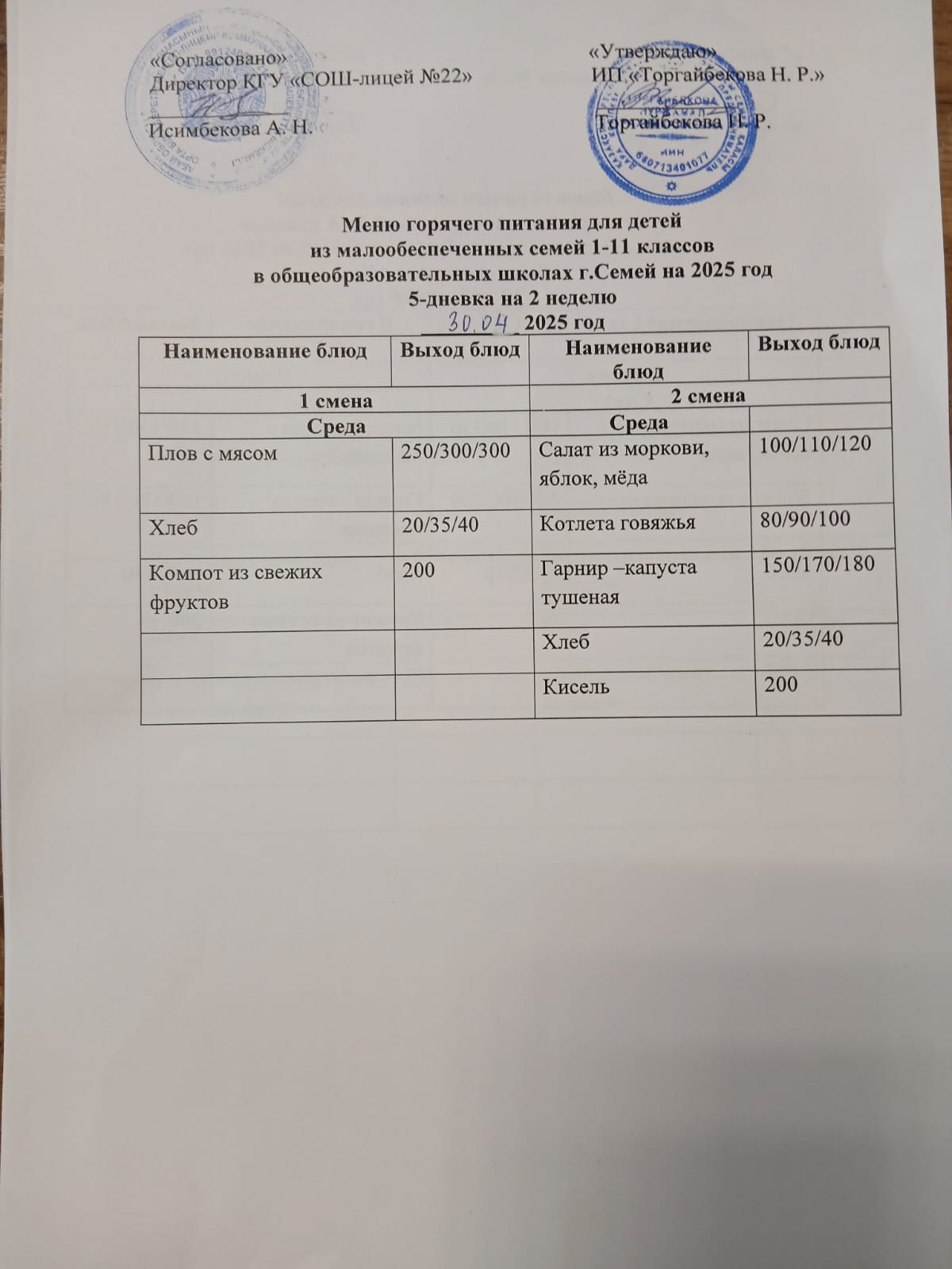 Күнделікті ас мәзірі/ 2 апта/ Сәрсенбі/ 1 ауысым жане 2 ауысым » Средняя общеобразовательная школа № 22