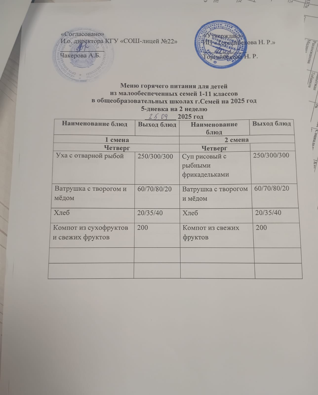 Күнделікті ас мәзірі/ 2 апта /Бейсенбі/ 1ауысым және 2 ауысым » Средняя общеобразовательная школа № 22
