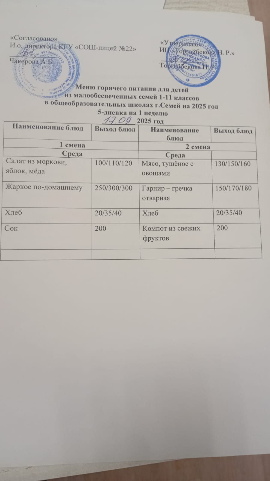 Күнделікті ас мәзірі/1 апта/Сәрсенбі/1 ауысым мен 2 ауысым » Средняя общеобразовательная школа № 22