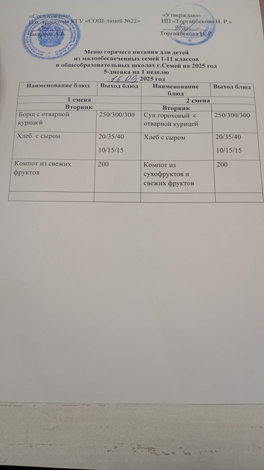 Күнделікті ас мәзірі/1 апта/ Сейсенбі/ 1 ауысым мен 2 ауысым » Средняя общеобразовательная школа № 22