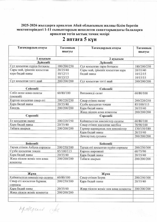 02 сентябрь 2025 Бекітілген мәзір