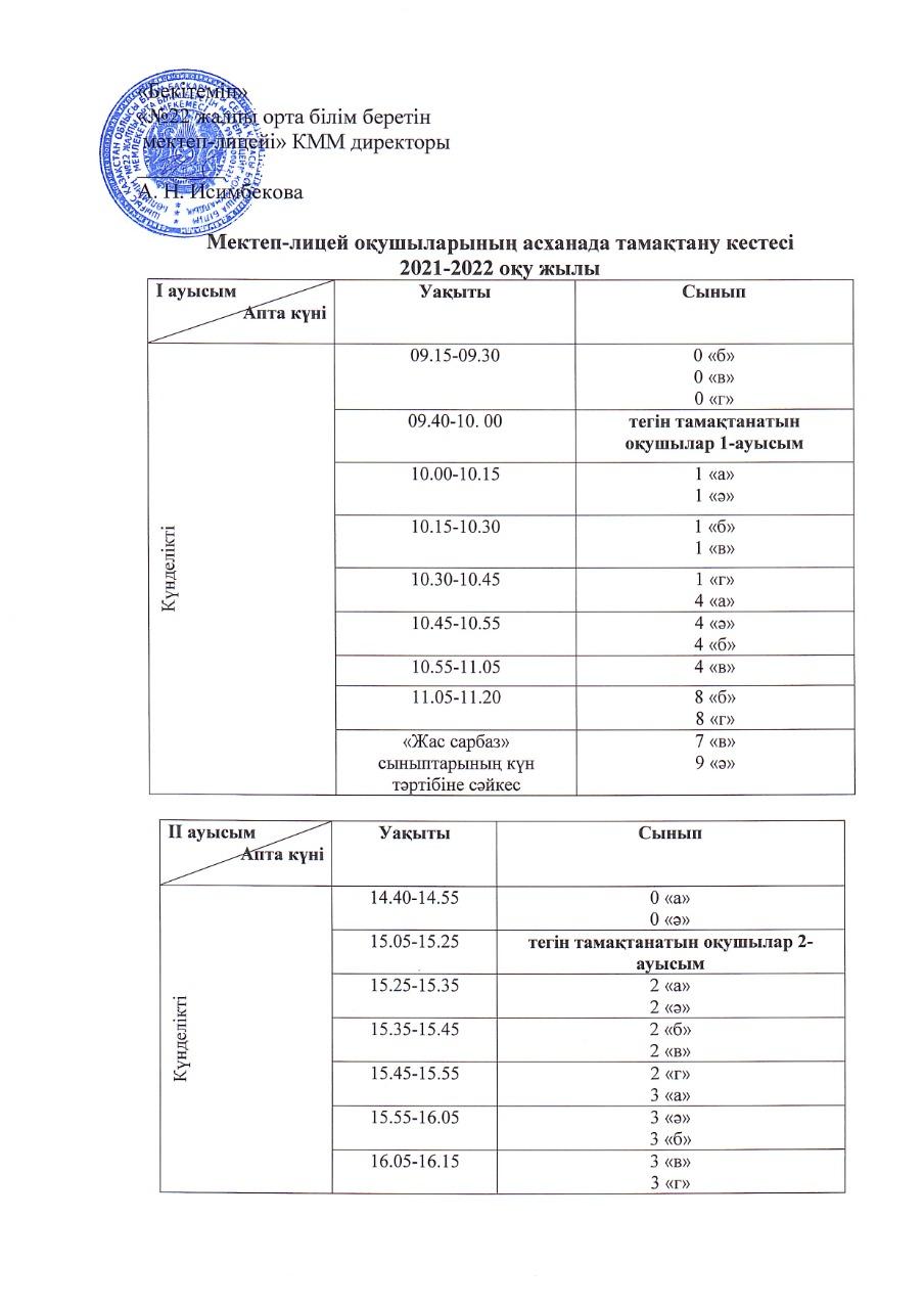 Мектеп-лицей оқушыларының асханада тамақтану кестесі