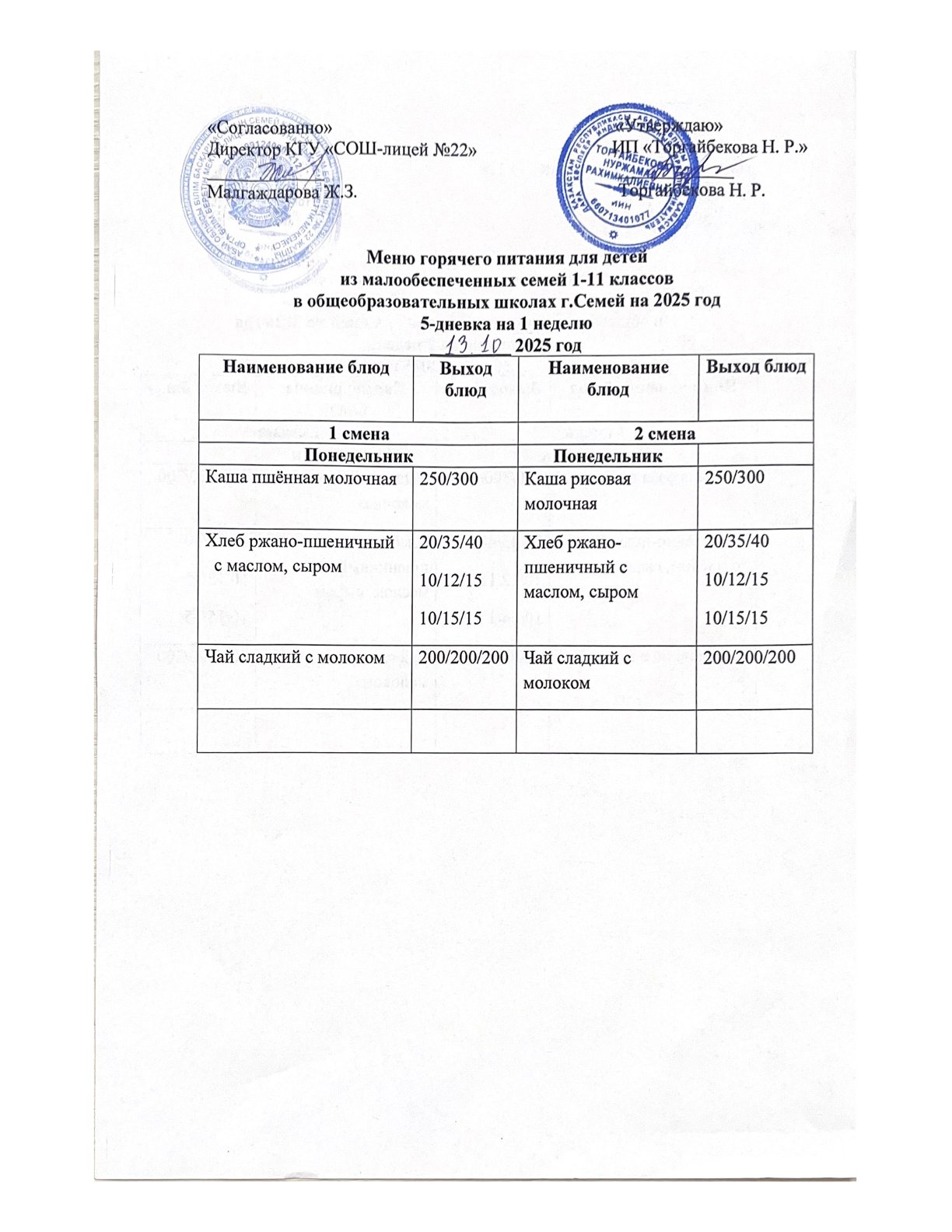 20 октябрь 2025 Күнделікті мәзір