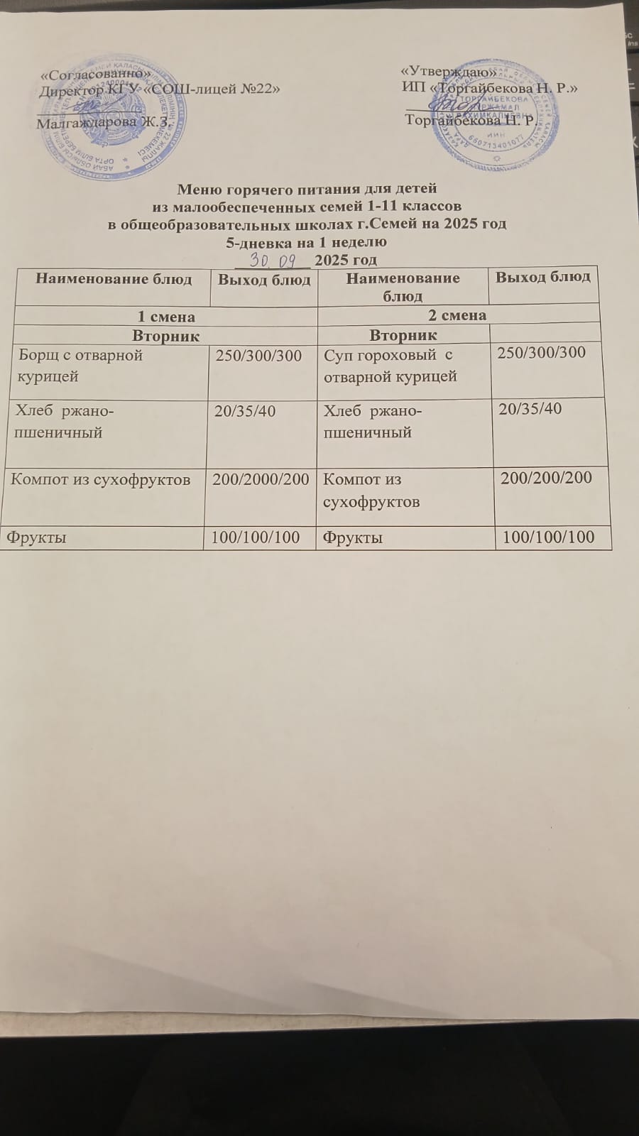 Күнделікті ас мәзірі 1 жане 2 ауысым » Средняя общеобразовательная школа № 22