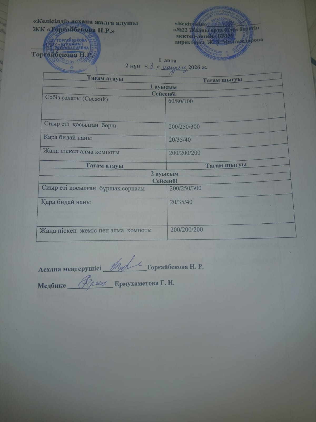 27 январь 2026 Күнделікті мәзір
