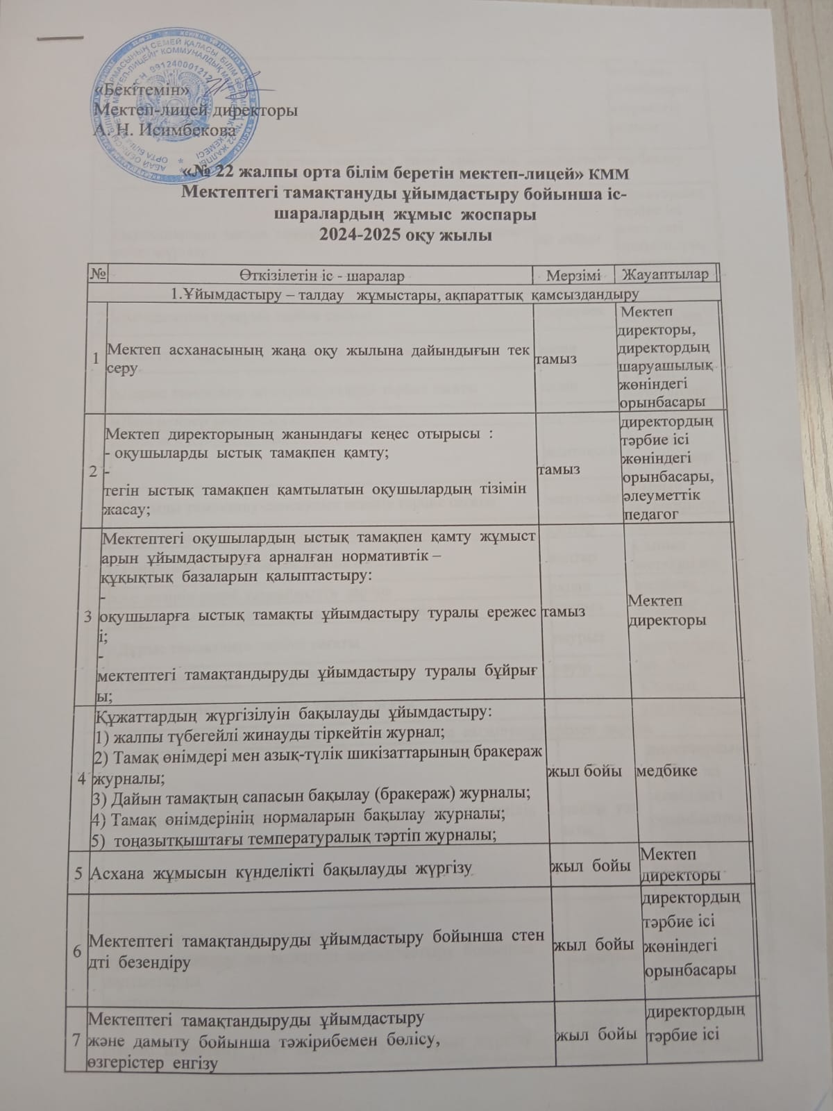 10 сентябрь 2024 0 1 2 3 4 5 Мектептегі тамақтануды ұйымдастыру бойынша 2024-2025 оку жылында атқарылатын iс-шаралар жоспары