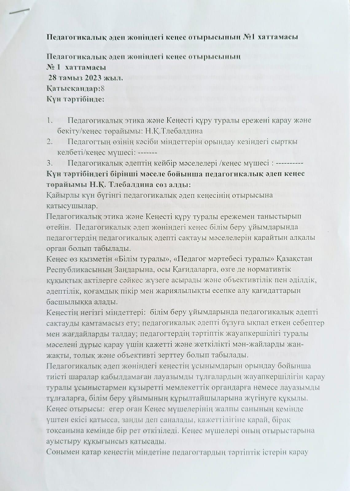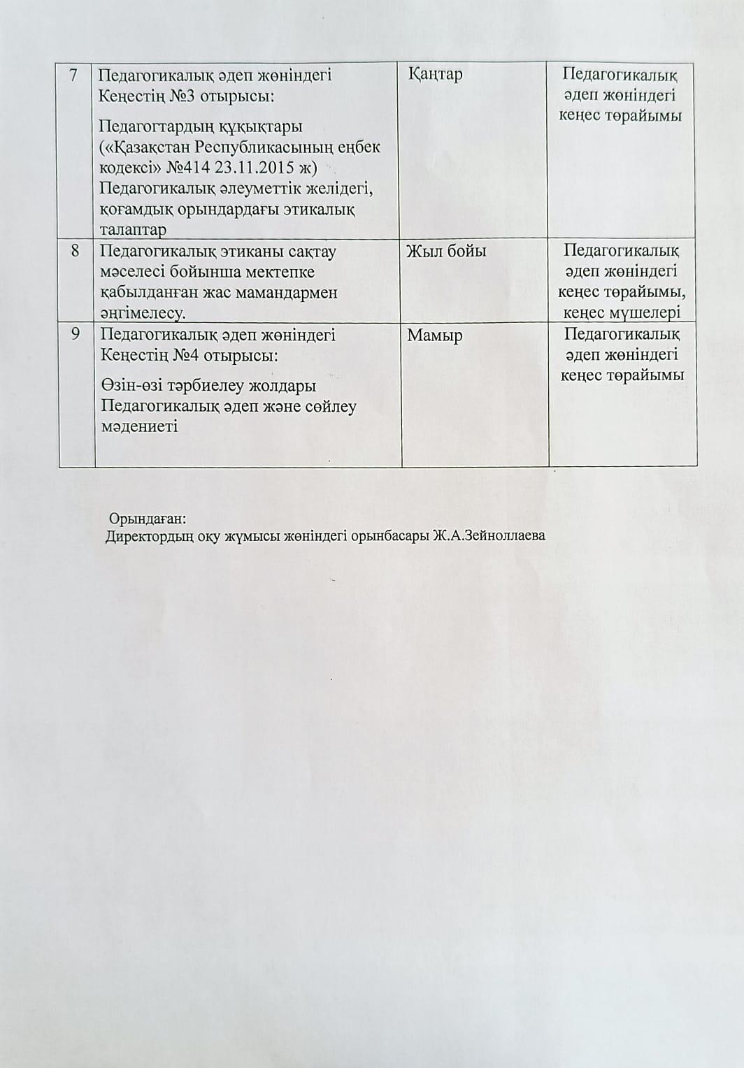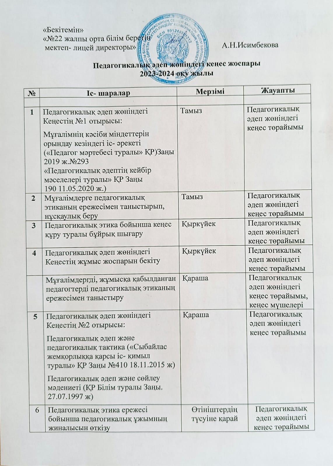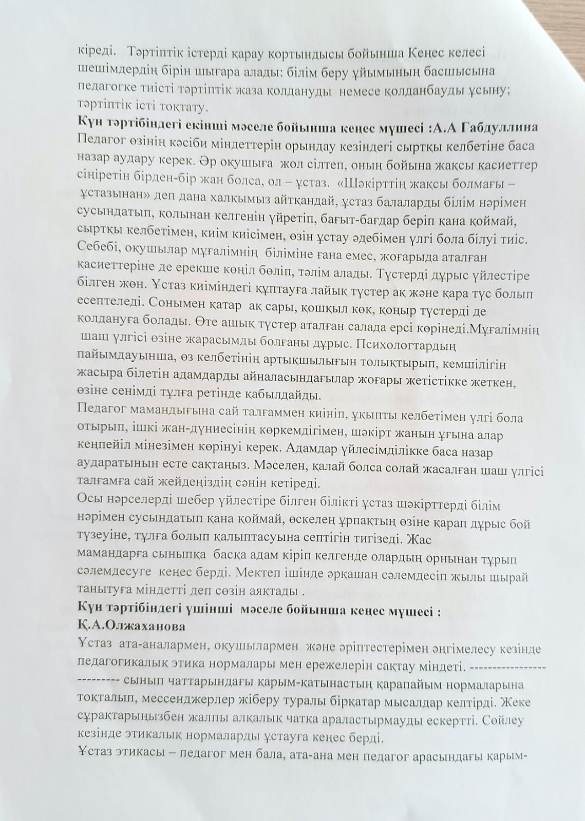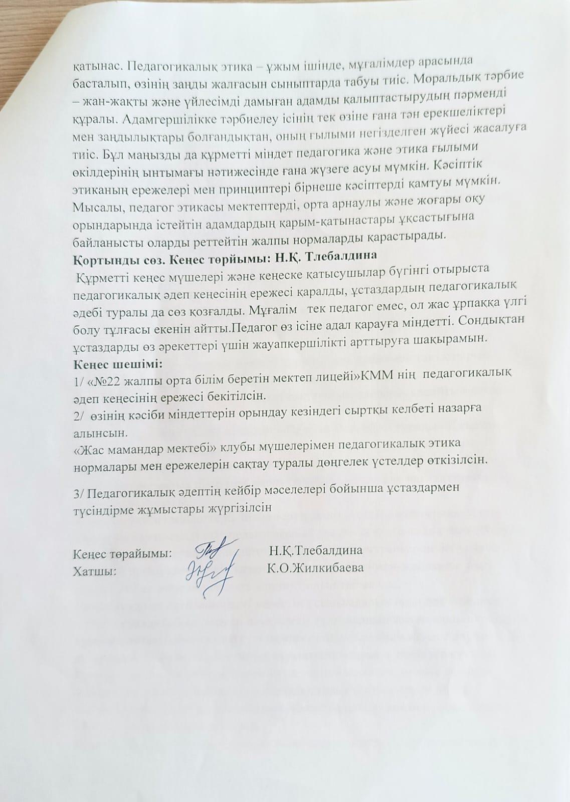 Педагогикалық әдеп кеңесінің жұмысы » Средняя общеобразовательная школа № 22