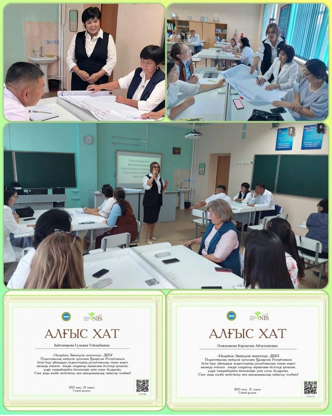 «Назарбаев Зияткерлік мектептері» ДББҰ Педагогикалық шеберлік орталығы Қазақстан Республикасы білім беру ұйымдары педагогтерінің республикалық тамыз кеңесі аясында өткізген пәндік секциялар жұмысына белсенді қатысып, үздік тәжірибеңізбен бөліскеніңіз үшін Байтемирова Гульжан Тойлыбаевнаға, Олжаханова Карлыгаш Абзалхановнаға АЛҒЫС ХАТ білді. Сізге жаңа кәсіби жетістіктер мен шығармашылық табыстар тілейміз!