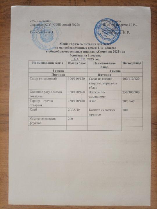 Күнделікті мәзір/ 1 апта/ Жұма/ 1 және 2 ауысым » Средняя общеобразовательная школа № 22
