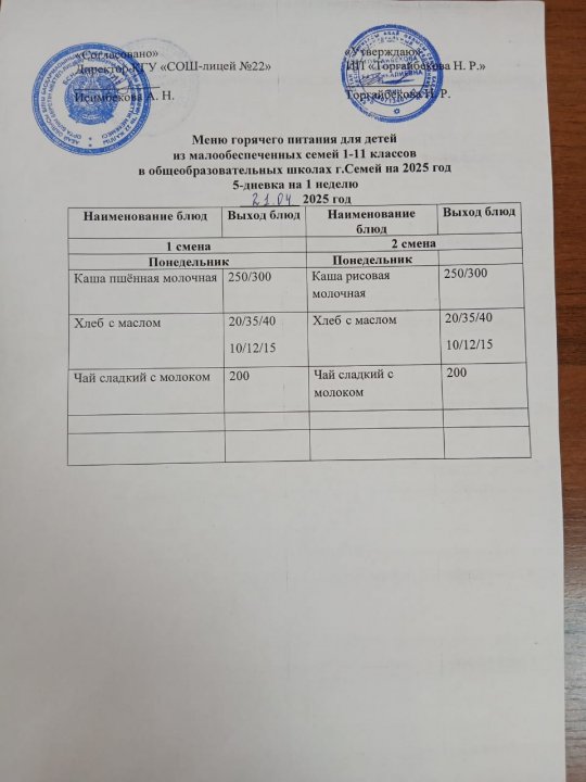 Күнделікті ас мәзірі/ 1 апта/ Дүйсенбі/ 1 ауысым жане 2 ауысым » Средняя общеобразовательная школа № 22