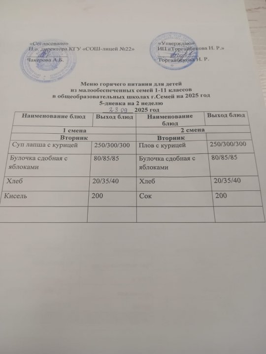 Күнделікті ас мәзірі/2 апта/ Сейсенбі/ 1 ауысым мен 2 ауысым » Средняя общеобразовательная школа № 22