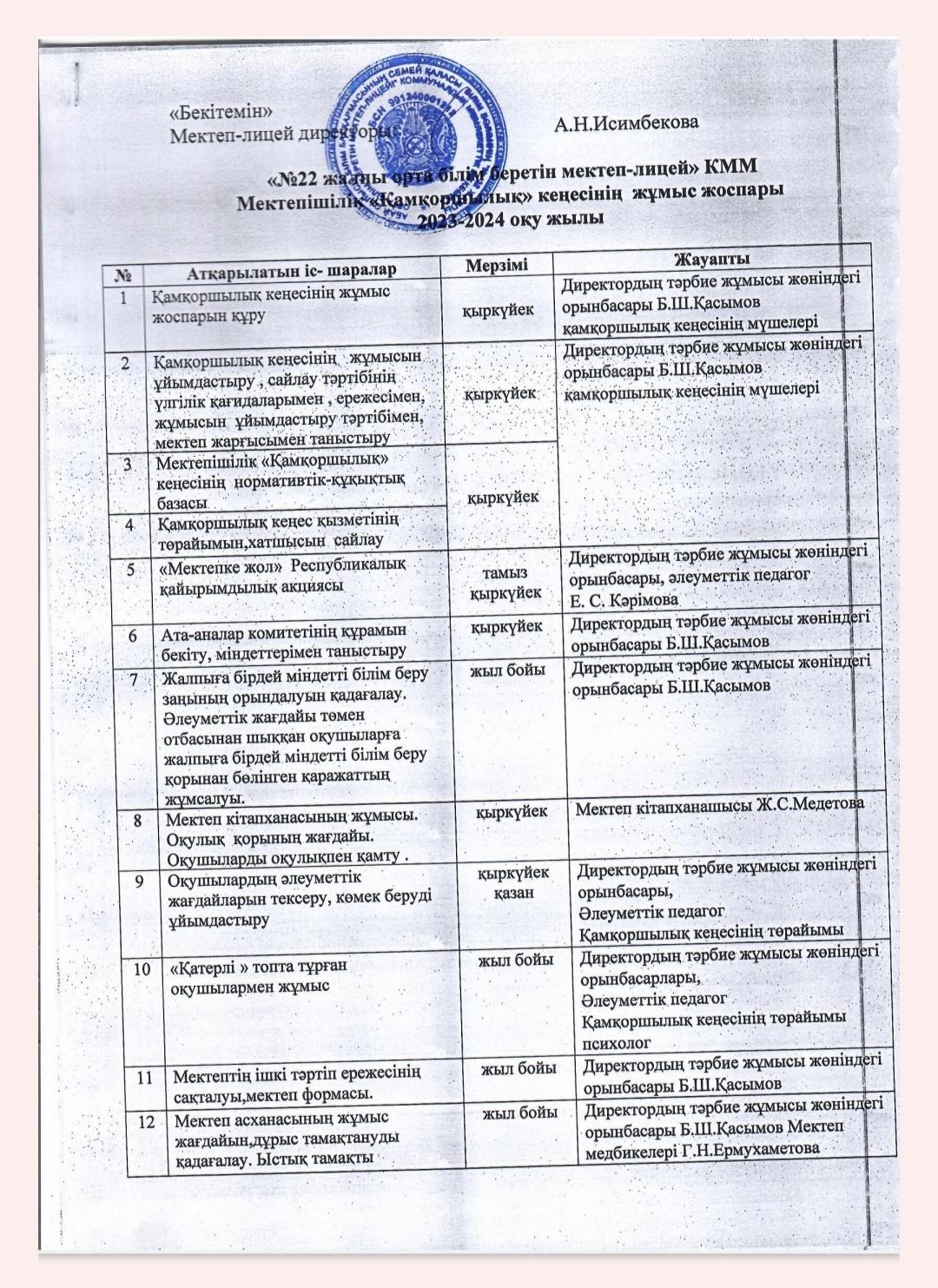Мектепішілік «Қамқорлық» кеңесінің жұмыс жоспары » Средняя общеобразовательная школа № 22