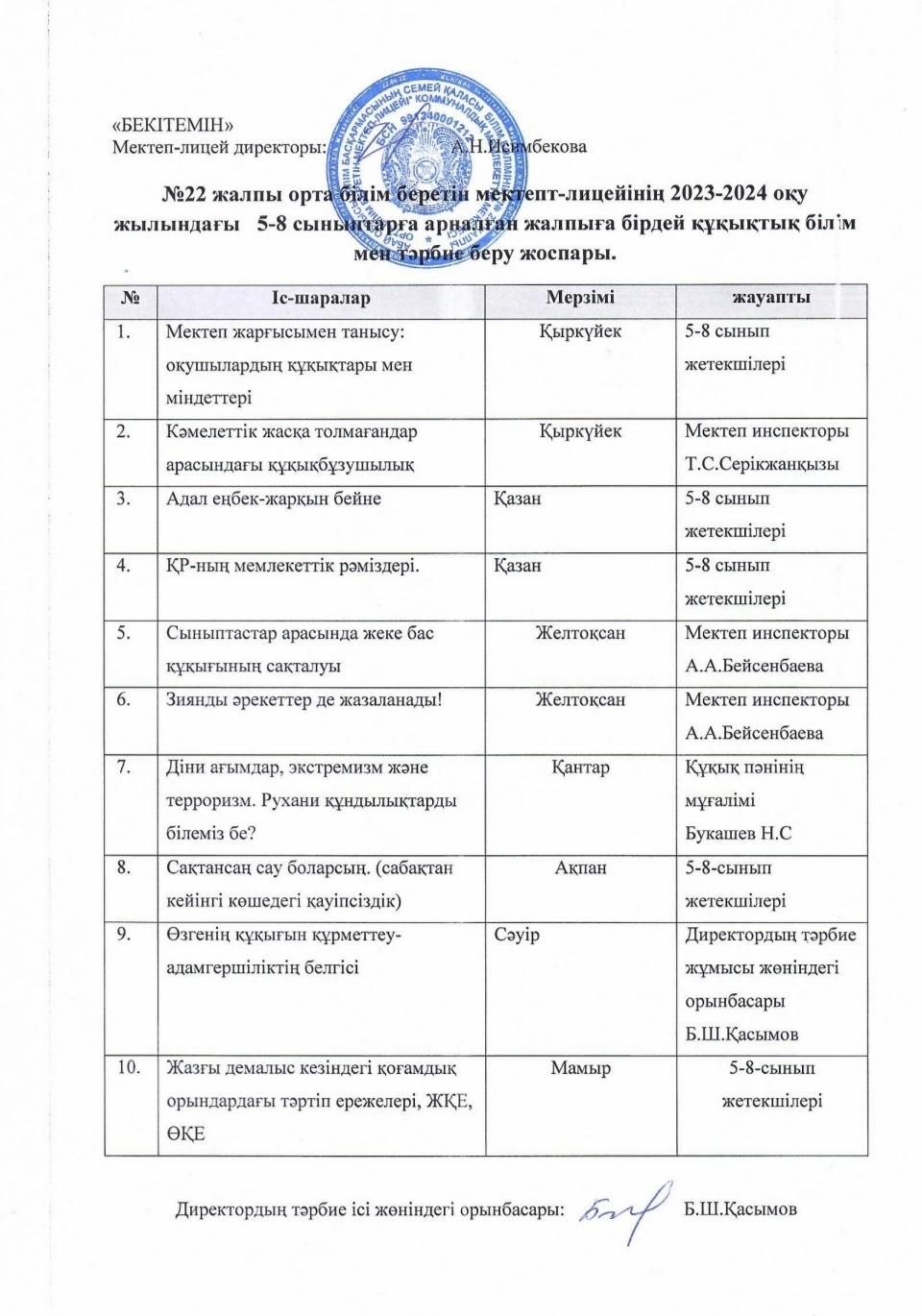 04 сентябрь 2023 0 1 2 3 4 5 №22 жалпы орта білім беретін мектепт-лицейінің 2023-2024 оку жылындағы 5-8 сыныптарға арналған жалпыға бірдей құқықтық білім мен тәрбие беру жоспары.