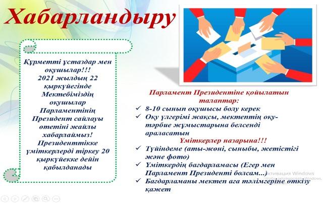 Мектебімізде өзін-өзі басқару ұйымы Парламентінің Президент сайлауына қызу жұмыс жүргізілуде. Үміткерлердің сайлауалды бағдарламалары мектебіміздің әлеуметтік желілеріне жүктелуде.