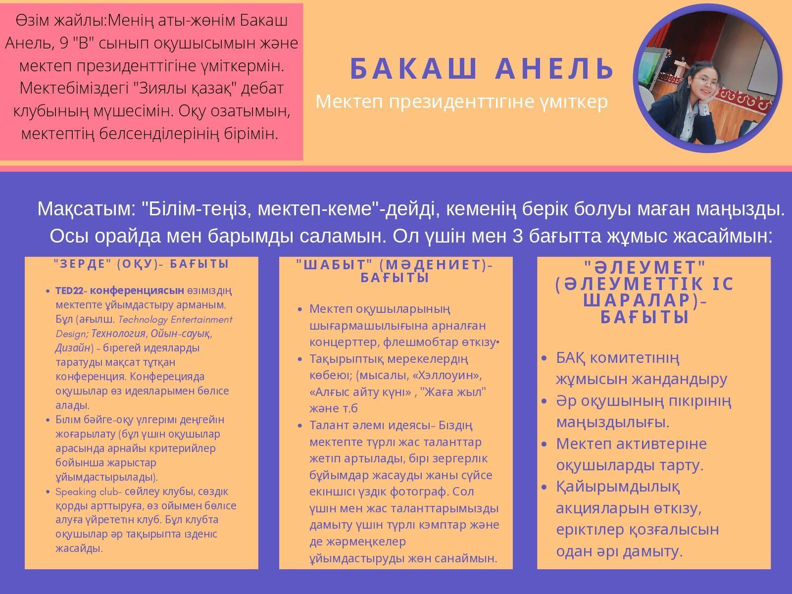 Мектеп Президенттігіне №3 үміткер-9 "В" сынып оқушысы Бакаш Анельдің сайлауалды бағдарламасымен танысып, 22 қыркүйек күні болатын сайлауда дауыс беруге шақырамыз!
